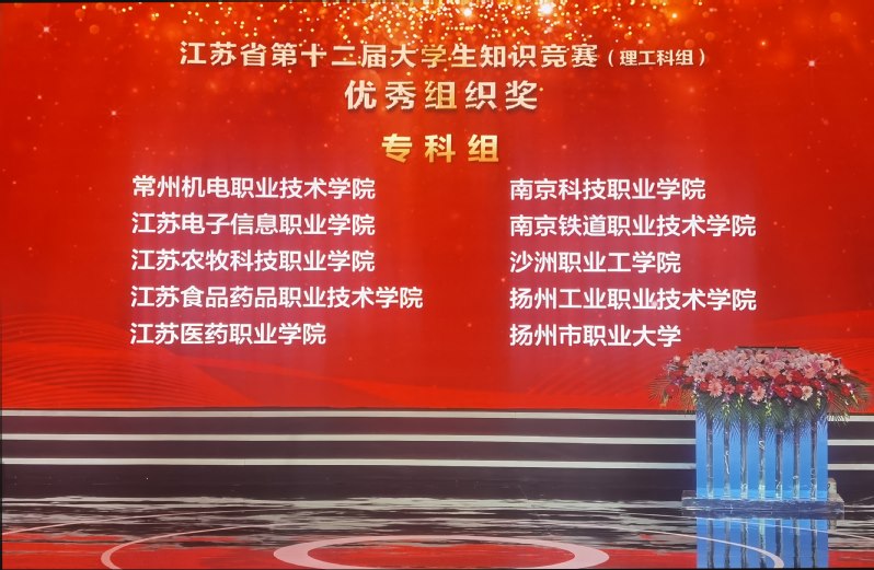 5月23日,江苏省第十二届大学生知识竞赛(理工科组)总决赛暨颁奖典礼在江苏教育频道演播厅举行。中国高等教育学会副会长张大良、省教育厅副厅长王成斌、省高等教育学会会长丁晓昌、我校副校长黄宝玲及相关参赛高校负责人出席并担任颁奖嘉宾。我校模具技术学院学生龚子舟喜获一等奖,学校获本届大赛“优秀组织奖”,学工处处长徐萍获“优秀组织管理者”称号。