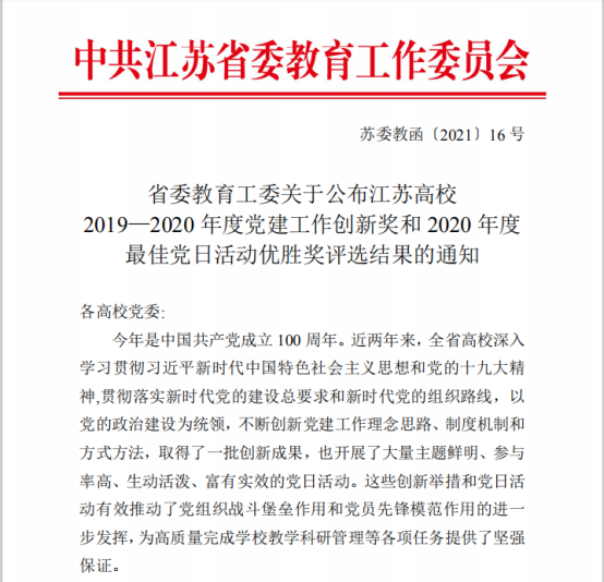 根据苏委教函〔2021〕16号《省委教育工委关于公布江苏高校2019—2020年度党建工作创新奖和2020年度最佳党日活动优胜奖评选结果的通知》,我校电子工程学院党总支《“课长制”党建育人模式创新实践》获江苏高校2019—2020年度党建工作创新奖二等奖,我校大外部党支部《用外国语言讲述中国故事,让青春时光浸染红色信仰》获2020年度高校“最佳党日活动”优胜奖。