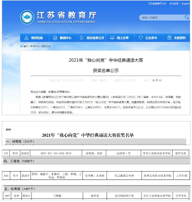 日前,在江苏省教育厅、江苏省语委、江苏省新闻出版局、江苏省全民阅读活动领导小组办公室公布的2021年“我心向党”中华经典诵读大赛复赛评审结果中,我校获特等奖1项,三等奖1项,优秀奖1项。这是我校长期以来扎实开展语言文字宣传工作,积极组织中华经典诵写讲系列活动所取得的又一项丰硕成果。