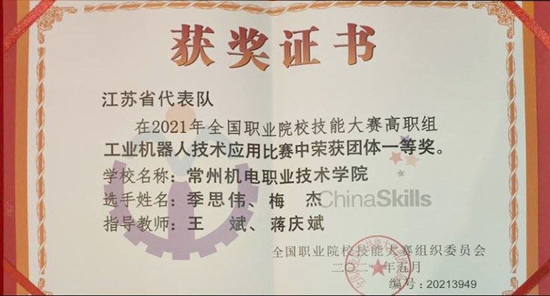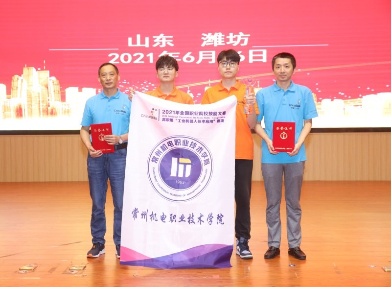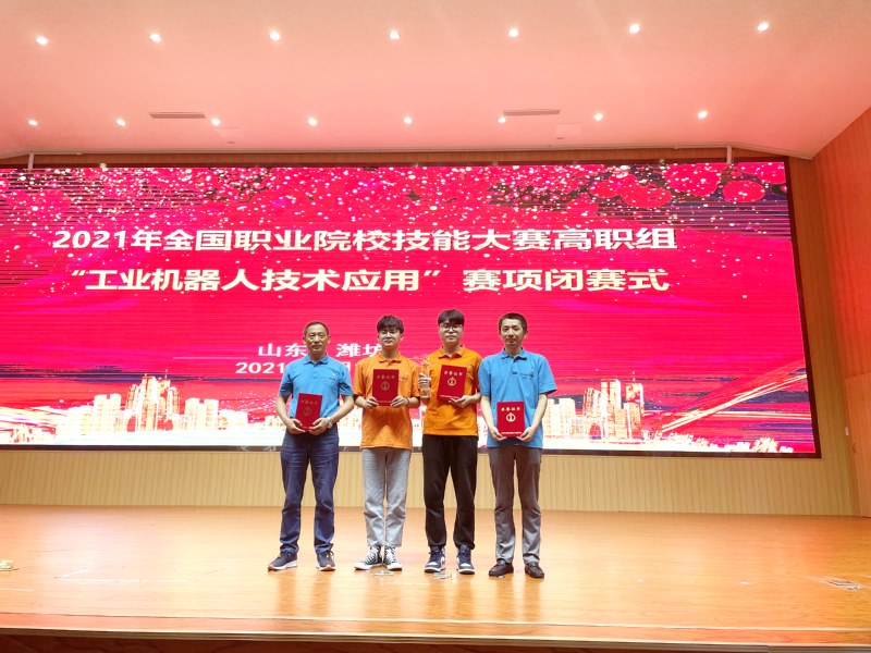 6月24日至6月25日,2021年全国职业院校技能大赛高职组“工业机器人技术应用”赛项在山东潍坊举行。全国30个省、自治区、直辖市的冠军代表队、60名选手参加比赛。我校电气工程学院学生季思伟和梅杰组队代表江苏省参赛,荣获该赛项一等奖。指导教师王斌和蒋庆斌获全国优秀指导教师荣誉称号。