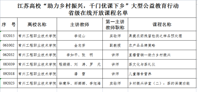 江苏省教育厅结合党史学习教育开展为民办实事系列活动之“助力乡村振兴,千门优课下乡”大型公益教育行动,旨在汇聚省内高校最优质的教学资源。经过一个多月的筹备和校内选拔,我校共推荐9门课程,最终,李运山老师的《果蔬农药残留检测之样品预处理》等6门课程,紧贴“三农”发展的实际需要,内容全面、形式新颖、通俗易懂。入选“助力乡村振兴,千门优课下乡”大型公益教育行动省级在线开放课程。