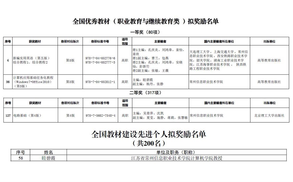 近日,教育部公示了首届全国教材建设奖拟奖励名单,我校校长眭碧霞教授担任主编,张静、杨丹担任副主编的《计算机应用基础任务化教程(Windows7+Office2010)》(第3版)获全国优秀教材(职业教育与继续教育类)一等奖;吴青萍、沈凯担任主编,夏莹、施静、蒋莉、张慧敏担任副主编的《电路基础(第4版)》获二等奖;曹兰担任副主编的《新编实用英语(第五版)综合教程1》《新编实用英语(第五版)综合教程2》获一等奖;眭碧霞获全国教材建设先进个人称号。
