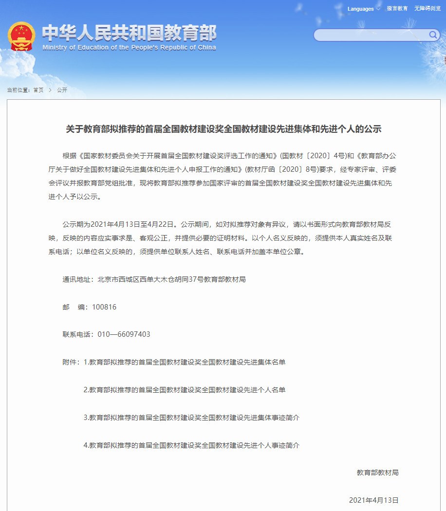 全国教材建设奖由国家教材委员会主办、教育部承办,每4年评选一次,旨在对各级各类优秀教材和作出突出贡献的先进集体、先进个人予以表彰,立足强导向、建机制、促建设,充分调动各方面的积极性,带动教材建设质量整体提升。2020年开展的首届全国教材建设奖评选是新中国成立以来首次设立全面覆盖教材建设各领域的专门奖励项目,也是全国教材建设领域的最高奖。