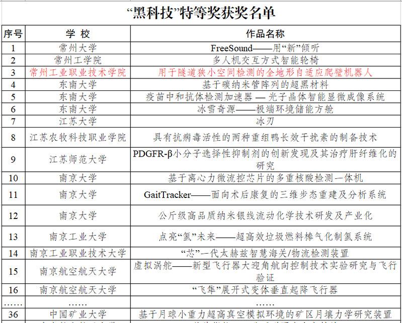 1 | 用于隧道狭小空间检测的全地形自适应滚动吸附机器人 | 张硕等 | 刘进福、刘娟、张书贵 | 第十七届“挑战杯”黑科技专项赛江苏省选拔赛特等奖 |
