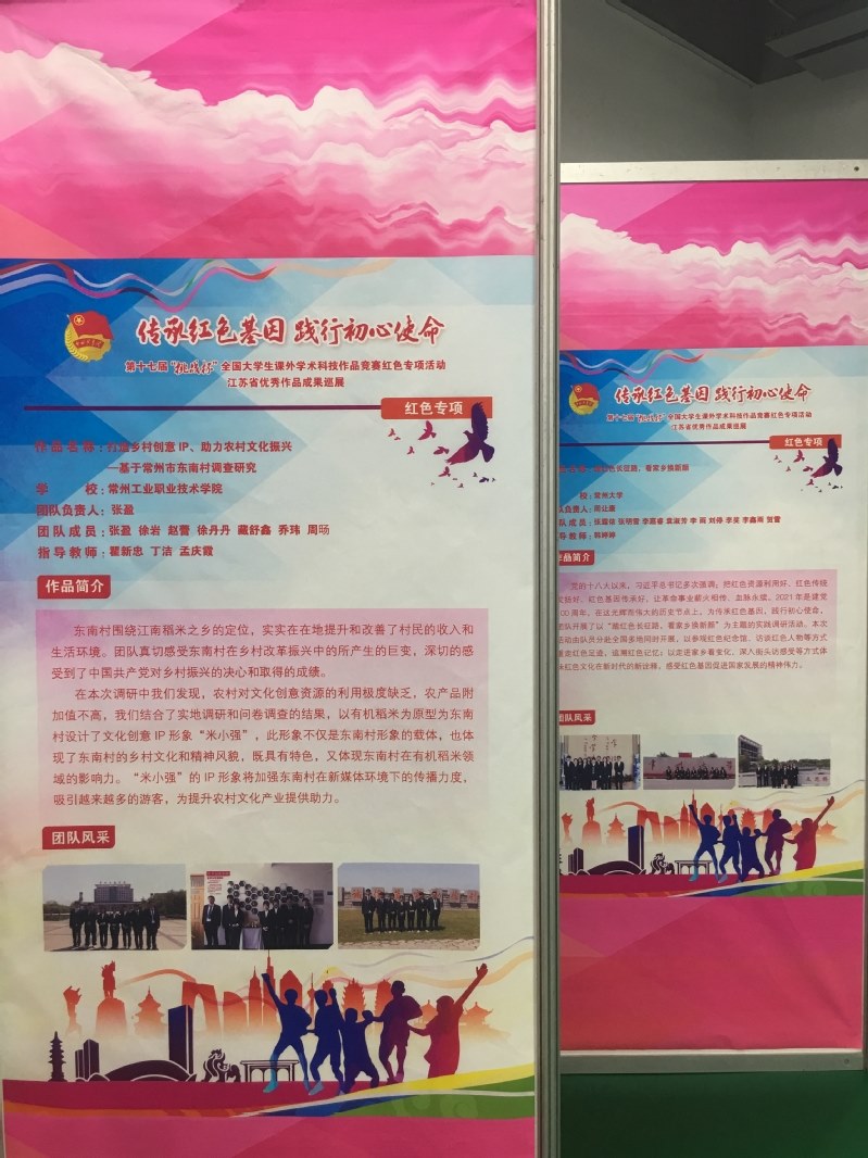 2 | 打造乡村创意IP,助力乡村文化振兴——基于常州市5个休闲农业精品村的调查研究 | 张盈等 | 瞿新忠、丁洁、孟庆霞 | 第十七届“挑战杯”红色专项赛江苏省选拔赛一等奖 |