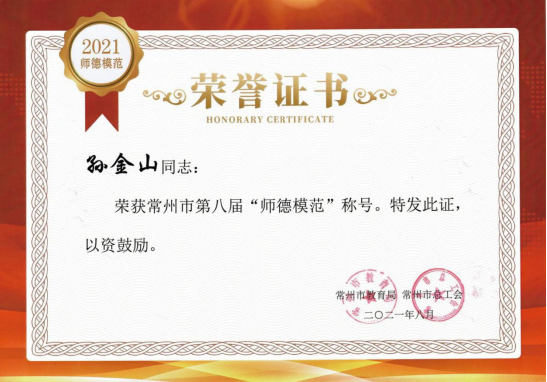 根据常州市教育局、常州市总工会下发的《关于公布常州市第八届师德标兵、师德模范的通知》(常教工〔2021〕14号)文件精神,我校孙金山老师被授予“常州市第八届师德模范”荣誉称号。