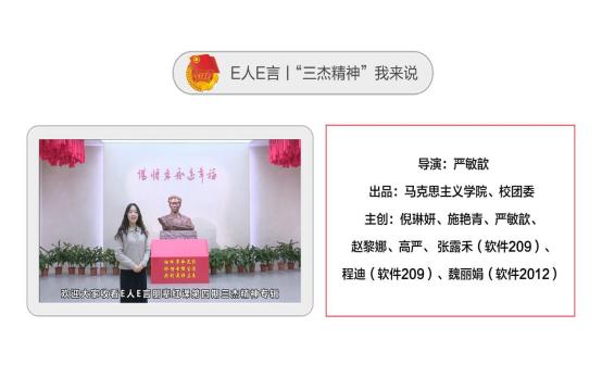信仰公开课《三杰精神》制作于2020年12月,是马克思主义学院和校团委联合推出的网络思政类素质教育精品项目《E人E言》的第四期访谈。该期访谈在常州张太雷纪念馆实景拍摄,由师生从常州三杰的生平事迹共同阐述何谓“三杰精神”、“三杰精神”和“中国精神”的关系、常信学子应该如何传承“三杰精神”。该期节目于去年12月通过“学习通”面向全校学生开放,共有近3200名学生自发观看。