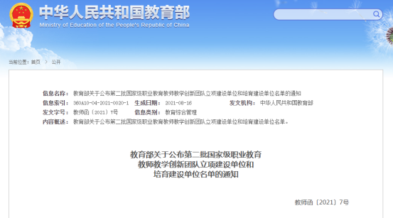 根据《教育部关于公布第二批国家级职业教育教师教学创新团队立项建设单位和培育建设单位名单的通知》(教师函〔2021〕7号),我校网络空间安全学院院长杨诚主持申报的新一代信息技术领域信息安全技术应用专业获得立项。