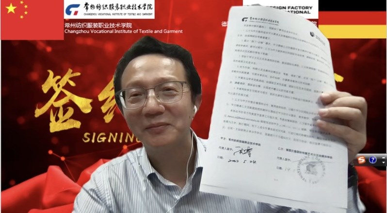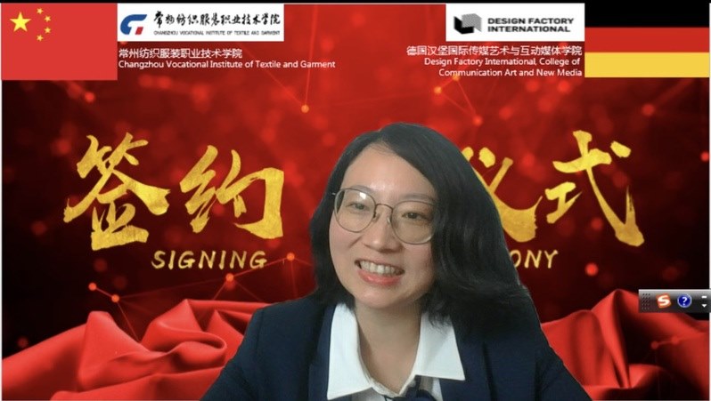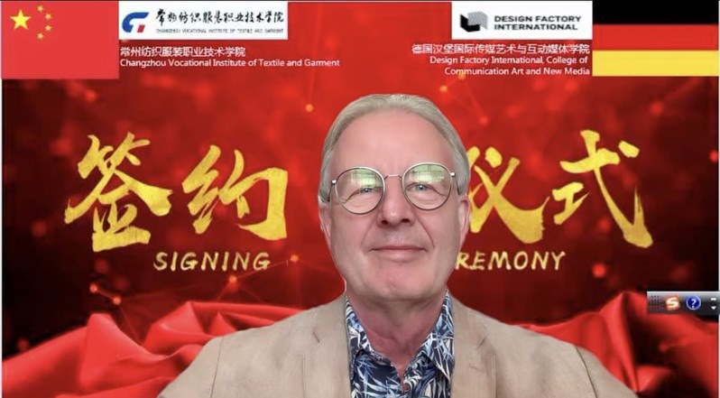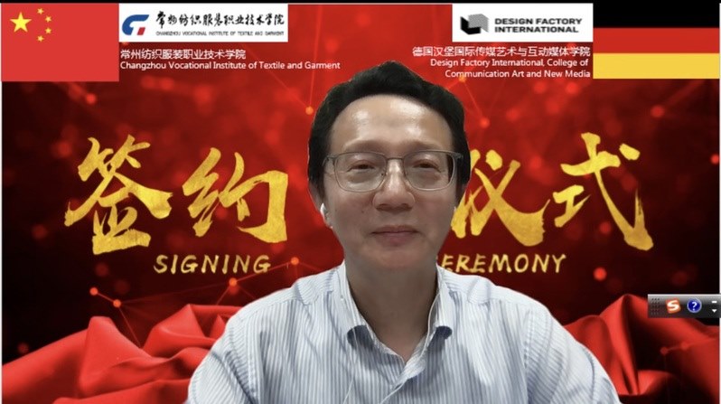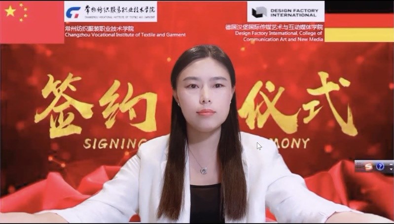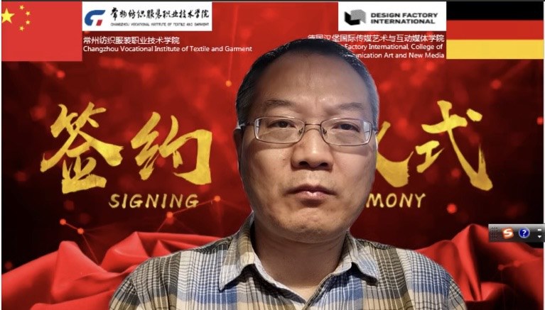 2022年5月24日北京时间 20:00,德国时间当日14:00,常州纺织服装职业技术学院—德国汉堡国际传媒艺术与互动媒体学院国际教育合作云签约仪式通过腾讯会议在线举行。德国汉堡国际传媒艺术与互动媒体学院总经理&校董Stefan Haarhaus、国际办公室对外合作项目负责人琚丹娅、中德产业创新与合作中心总经理唐栎铭、副总经理刘勇军,学校党委副书记、院长洪霄出席了签约仪式。会上,洪霄与Stefan Haarhaus签署了合作协议并作讲话,双方就专业发展理念、专业建设、课程教学、交流互访等内容进行了深入交流。教务处处长夏冬、外事办主任顾剑柳及创意学院院长李方联等同志参加了此次签约仪式,会议由顾剑柳主持。