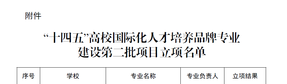 江苏省第二批高校国际化人才培养省级品牌专业立项建设100个,其中“立项资助”项目50个,“立项不资助”项目50个,项目建设周期为4年。