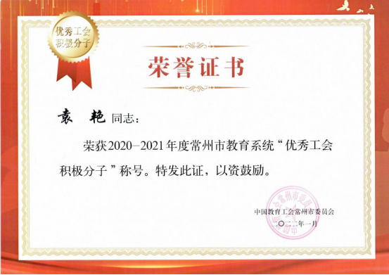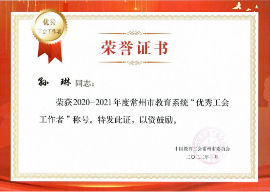 根据常州市教育工会《关于公布2020—2021年度常州市教育系统优秀工会工作者、优秀工会积极分子、优秀工会之友遴选结果的通知》常教工〔2022〕1号文件,常州信息职业技术学院王钧铭荣获2020—2021年度常州市教育系统“优秀工会之友”称号;孙琳荣获2020—2021年度常州市教育系统“优秀工会工作者”称号;袁艳荣获2020—2021年度常州市教育系统“优秀工会积极分子”称号。(文、图/孙琳 审/彭军 张煜任文珺)