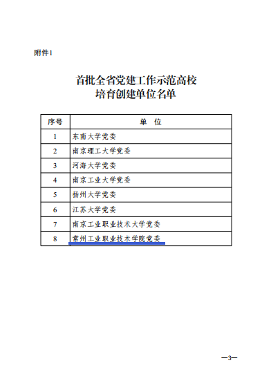 近日,江苏省教育厅公布了新时代江苏高校三级党组织“强基创优”建设计划首批遴选结果,常州工业职业技术学院入选“全省党建工作示范高校”,成为江苏省唯一入选的高职专科院校。这是继智能控制学院党总支入选第三批“全国党建工作标杆院系”培育创建单位、旅游与烹饪学院教师第一党支部入选第三批“全国党建工作样板支部”培育创建单位之后,学校在基层党组织建设方面,取得的又一项重要成果。
