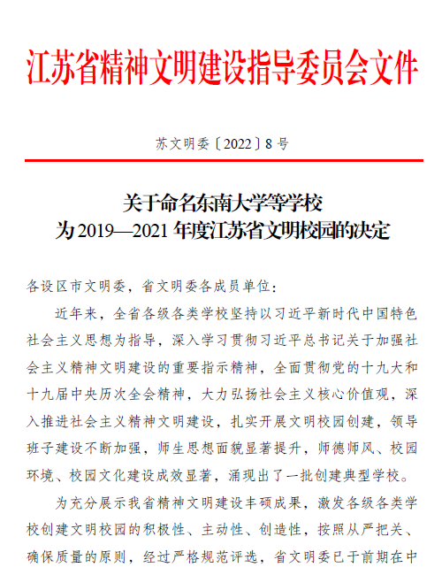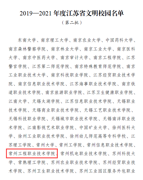 近日,江苏省精神文明建设指导委员会下发《关于命名东南大学等学校为2019—2021年度江苏省文明校园的决定》(苏文明委〔2022〕8号),常州工程职业技术学院再次喜获“江苏省文明校园”称号。