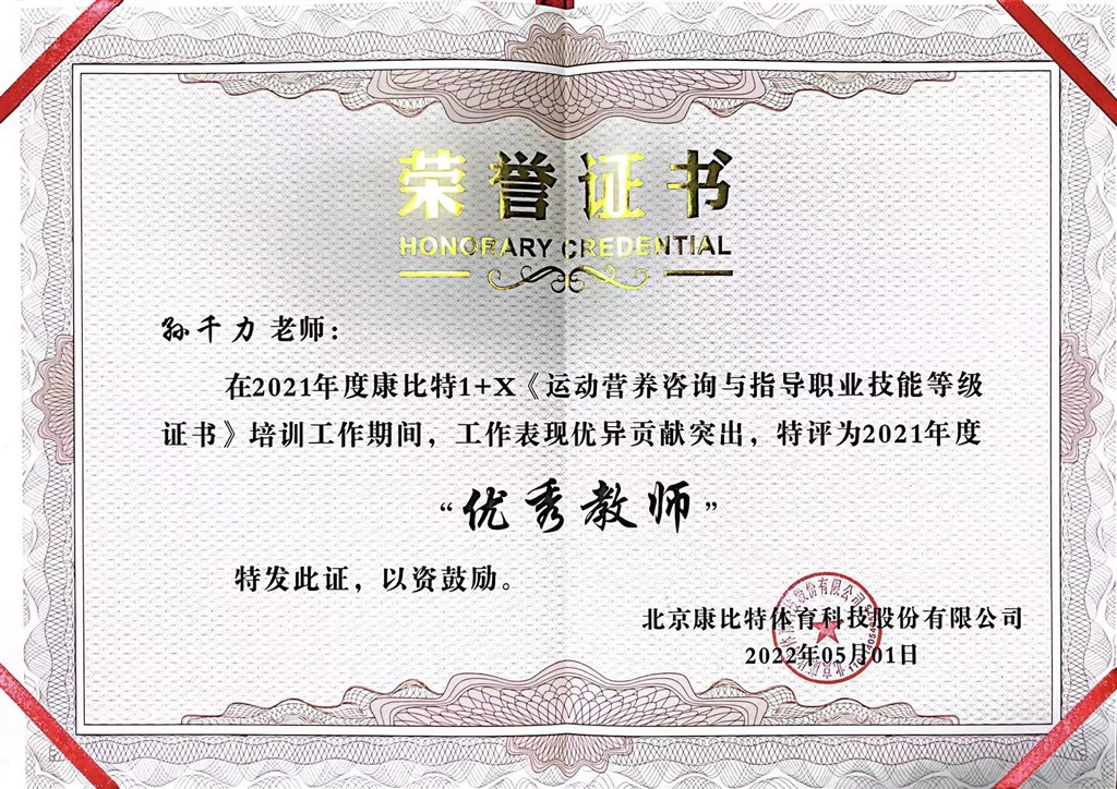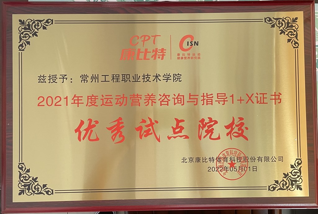 日前,常州工程职业技术学院因在1+X证书制度试点工作中取得的优异成绩,连续第二次获得“运动营养咨询与指导1+X证书”考核优秀试点院校。体育学院孙千力老师在2021年度康比特1+X《运动营养咨询与指导职业技能等级证书》培训工作期间,工作表现优异,被评为“优秀教师”。