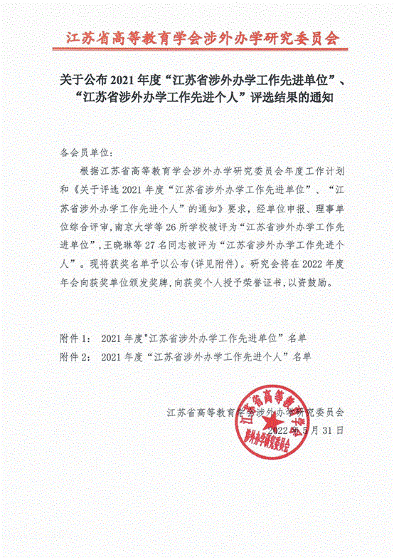 学校自2006年起经江苏省教育厅批准教育部备案与韩国明知专门大学开展中外合作办学项目,至今已培养了一大批国际化人才。此次被评为涉外办学工作先进单位是对学校中外合作办学项目办学质量和水平的充分肯定。