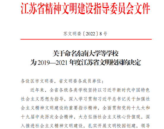 近日,江苏省精神文明建设指导委员会印发了《关于命名东南大学等学校2019—2021年度江苏省文明校园的决定》(苏文明委[2022]8号),常州信息职业技术学院荣获“2019—2021年度江苏省文明校园”,这是学校自2013年起连续10年获得此项荣誉。