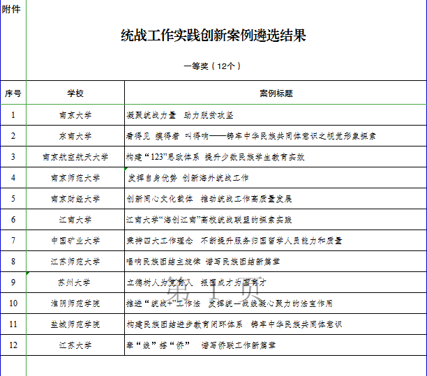 近日,江苏省委教育工委面向全省高校开展了“同心向党·教育有我”统战工作实践创新案例征集。经学校申报、专家评审,全省最终遴选出68个优秀创新案例,其中一等奖12个、二等奖26 个、三等奖30个。我校党委统战部报送的《创建“一体两翼三化”统战阵地 助力学校高质量发展》案例荣获二等奖,实现统战工作历史性突破。