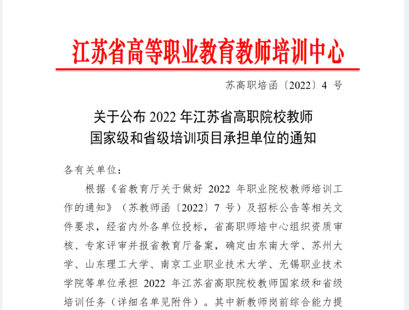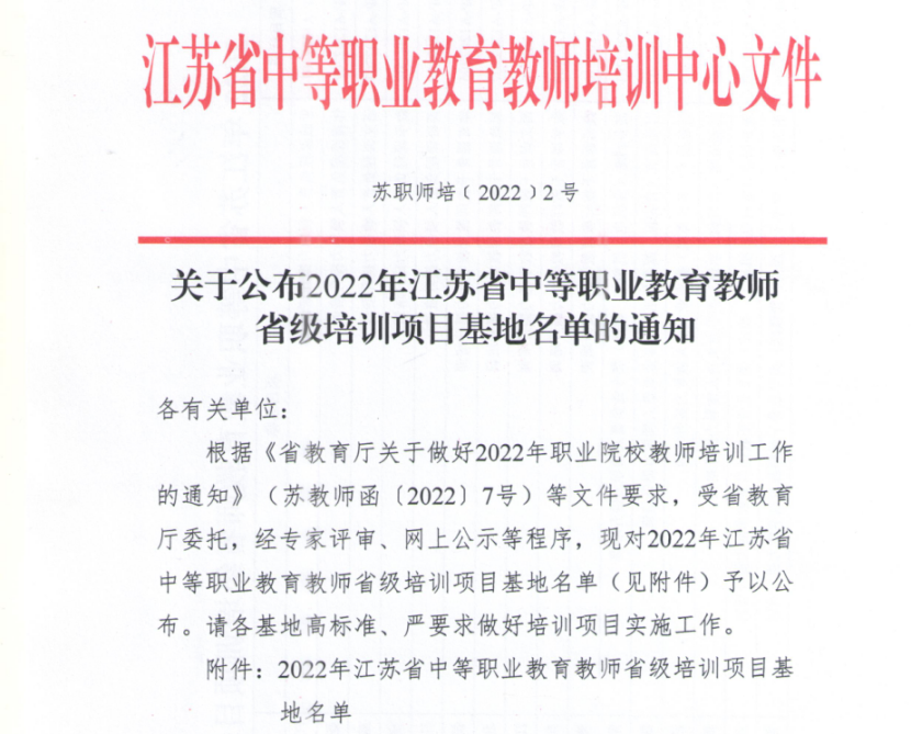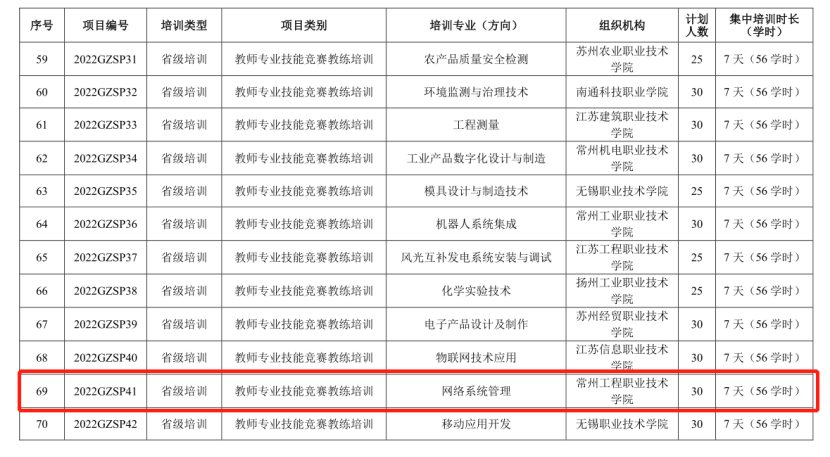 日前,江苏省高等职业教育教师培训中心和江苏省中等职业教育教师培训中心分别发布《关于公布2022年江苏省高职院校教师国家级和省级培训项目承担单位的通知》和《关于公布2022年江苏省中等职业教育教师省级培训项目基地名单的通知》,常州工程职业技术学院获批承担江苏省高职院校教师“专业技能竞赛教练培训(网络系统管理)”和中职院校教师“技能大赛教练培训(化工生产与分析技术)”等2项省培项目。