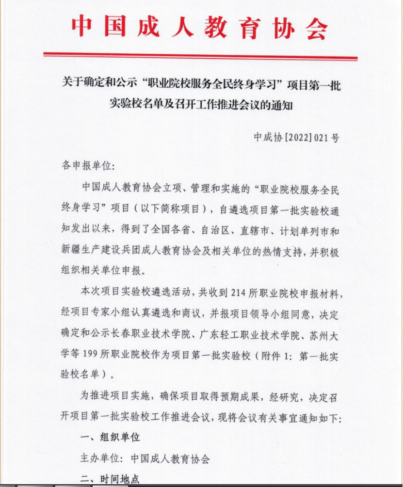 日前,中国成人教育协会发布《关于确定和公示“职业院校服务全民终身学习”项目第一批实验校名单及召开工作推进会议的通知》(中成协〔2022〕21号),公布全国“职业院校服务全民终身学习”项目第一批实验校名单,常州工程职业技术学院成功入选第一批实验校,标志着学校在服务全民终身学习方面成绩得到社会广泛认可,形成了良好的社会声誉。