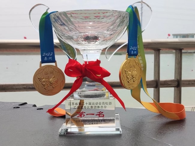 28日上午,随着发令枪响,赛道上飞舟竞渡、挠桨飞舞,在铿锵有力、节奏鲜明的鼓点声中,参赛龙舟犹如离弦之箭,飞驶终点。经过激烈角逐,学校龙舟队以53秒79的优异成绩获得200米混合直道赛决赛的冠军,此成绩在所有参赛队伍中同样名列第一。29日上午,500米混合直道赛开赛,比赛现场群龙击水,劈波斩浪,加油呐喊声阵阵不息。与200米赛项不同的是,该赛项对运动员的体能是一个极大的考验。队员们积极热身,相互鼓励,调整出最佳竞技状态。以2分09秒的优异成绩获得500米混合直道赛决赛的冠军。最终,以团体总分第一的成绩拿下江苏省第二十届运动会高校部龙舟比赛的“大满贯”。