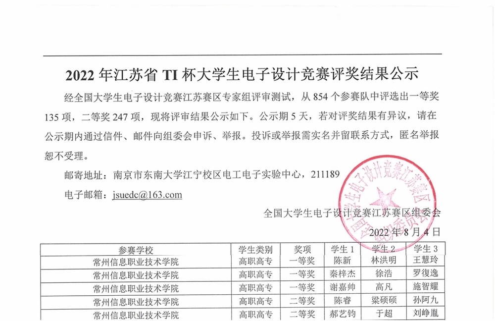 2022年江苏省大学生电子设计竞赛于7月27日至7月30日举行。根据组委会消息,常州信息职业技术学院12支参赛队伍斩获一等奖3项、二等奖2项共计5个奖项。