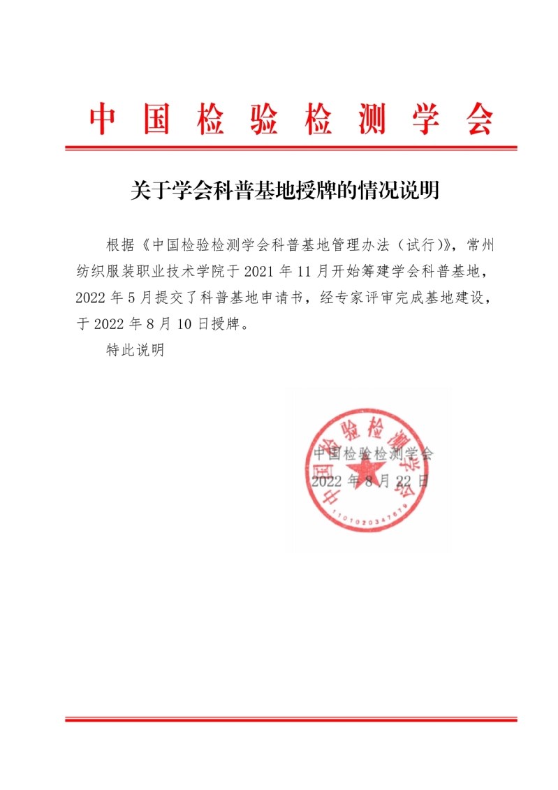 为深入贯彻中央十九届历次全会精神,坚持人民至上理念,落实党中央、国务院关于科普和科学素质建设的重要部署及《全民科学素质行动规划纲要(2021—2035年)》,加强科普基础设施建设,推进全国科普教育基地发展。根据《中国检验检测学会科普基地管理办法(试行)》,常州纺织服装职业技术学院于2021年11月开始筹建中国检验检测学会科普基地,2022年5月提交了科普基地申请书,经专家评审,被认定为学会科普基地。2022年8月10日,中国检验检测学会常务副会长生飞为学会科普基地常州纺织服装职业技术学院授牌,学校党委书记吴访升代表学校接受授牌。