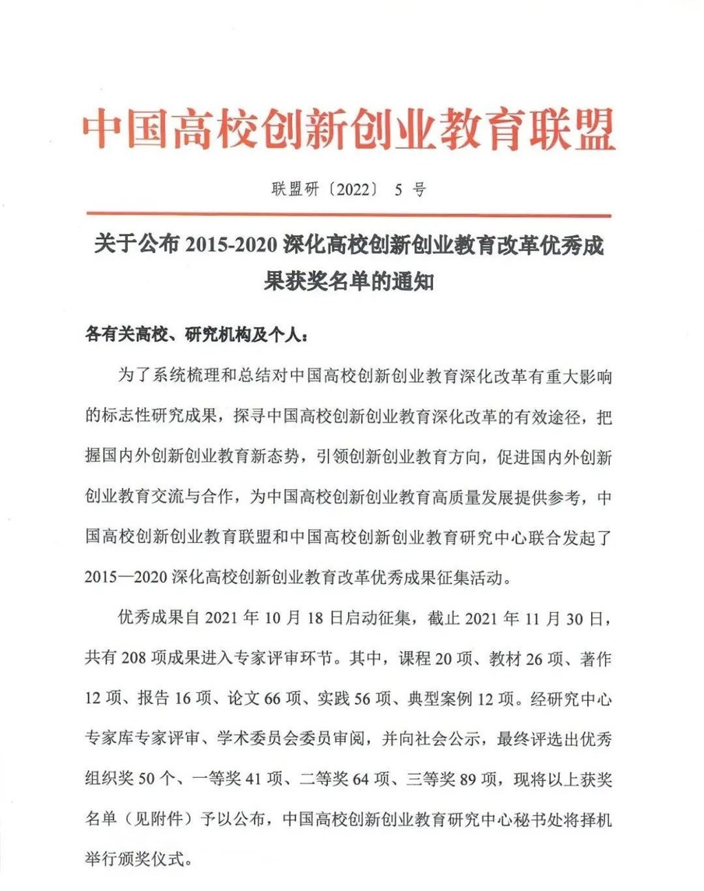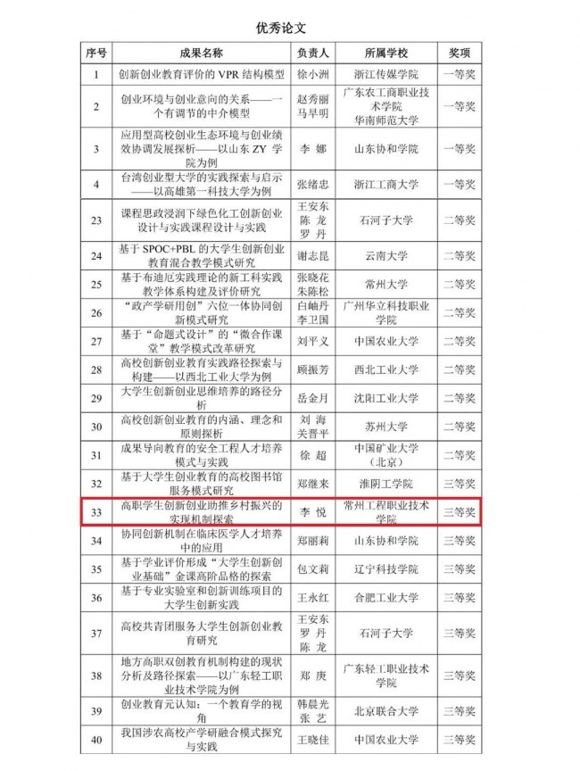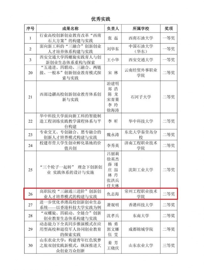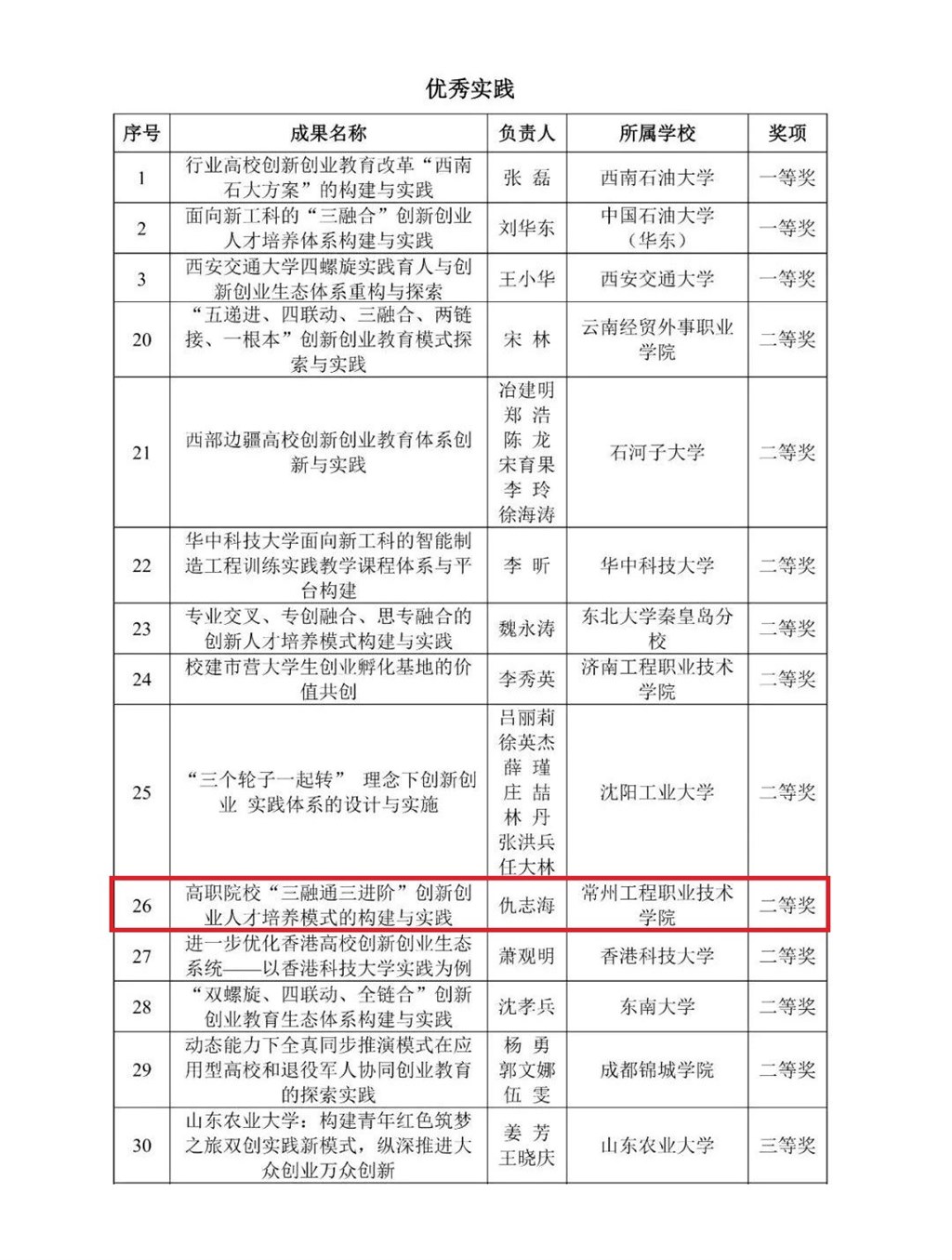 近日,中国高校创新创业教育联盟公布“2015-2020深化高校创新创业教育改革优秀成果”名单,常州工程职业技术学院在系列奖项评选中喜获多项荣誉。创新创业学院仇志海老师申报的《高职院校“三融通三进阶”创新创业人才培养模式的构建与实践》荣获优秀实践二等奖。设计学院李悦老师撰写的论文《高职学生创新创业助推乡村振兴的实现机制探索》荣获优秀论文三等奖,常州工程学院荣获优秀组织奖(全国共50家)。