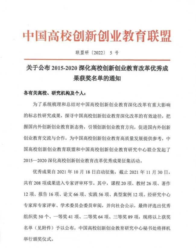 本次评选由中国高校创新创业教育联盟和中国高校创新创业教育研究中心联合发起,主要征集了2015-2020五年间的深化高校创新创业教育改革相关研究成果,旨在系统梳理和总结对中国高校创新创业教育深化改革有重大影响的标志性研究成果,探寻中国高校创新创业教育深化改革的有效途径,把握国内外创新创业教育新态势,引领创新创业教育方向,促进国内外创新创业教育交流与合作,为中国高校创新创业教育高质量发展提供参考。