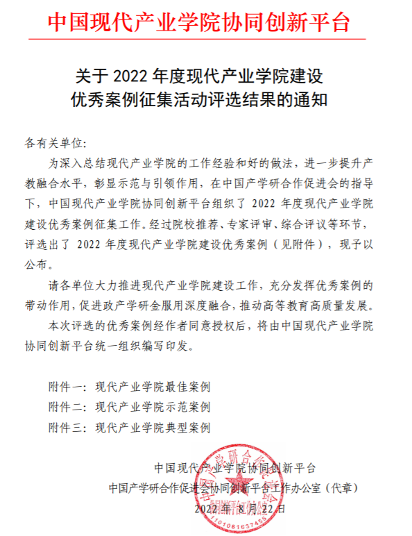 为深入总结现代产业学院的工作经验和做法,进一步提升产教融合水平,彰显示范与引领作用,中国现代产业学院协同创新平台组织了2022年度现代产业学院建设优秀案例征集工作,经过院校推荐、专家评审、综合评议等环节,共评选出了 2022年度现代产业学院建设优秀案例,其中最佳案例7个,示范案例21个,典型案例39个。