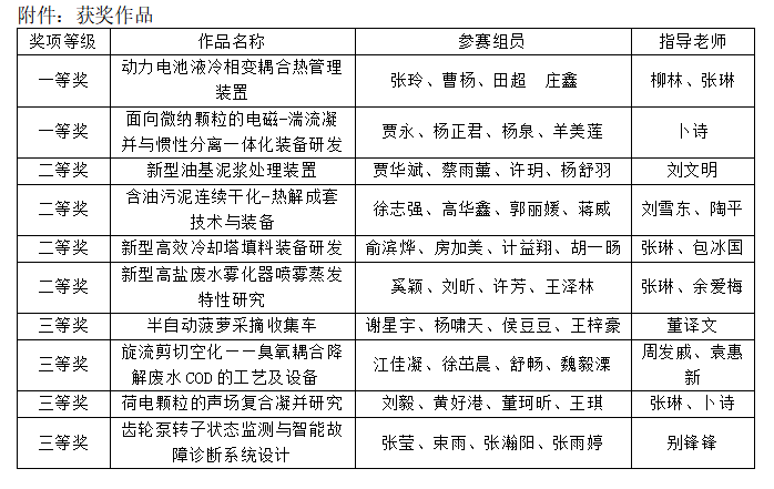 常州大学机械与轨道交通学院 智能制造产业学院张玲、曹杨、田超、庄鑫等学生作品《动力电池液冷相变耦合热管理装置》获本科生组一等奖,贾永、杨正君、杨泉、羊美莲等学生作品《面向微纳颗粒的电磁——湍流凝并与惯性分离一体化装备研发》获研究生组一等奖,学校获二等奖4项、三等奖4项,机械与轨道交通学院 智能制造产业学院张琳教授、柳林博士、卜诗博士获评优秀指导老师。
