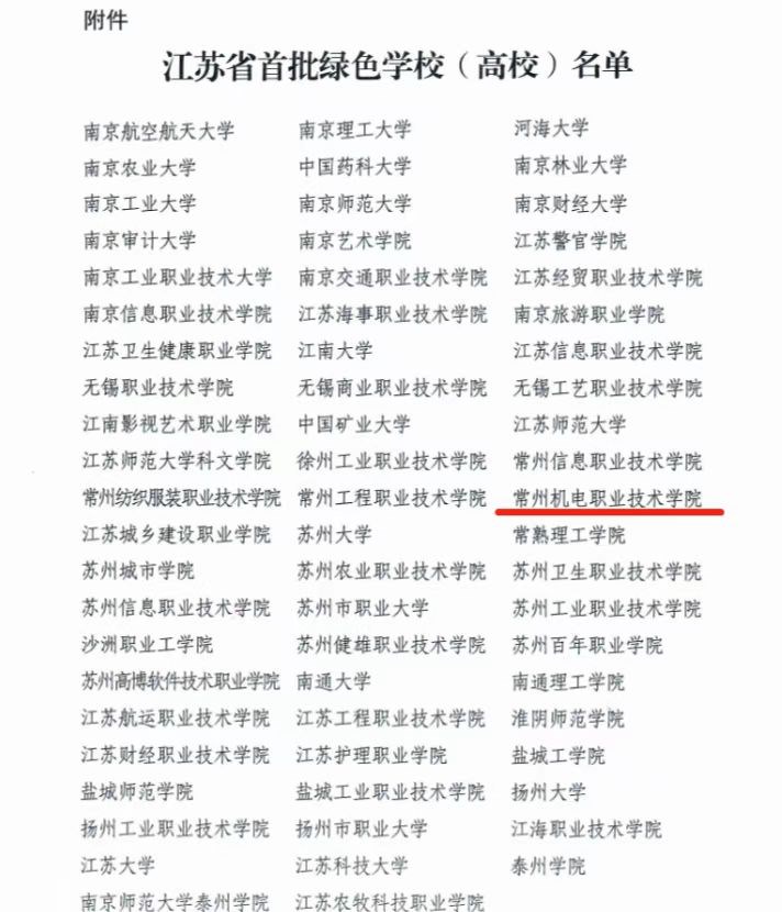 近日,省教育厅、省发改委等四部门发布《省教育厅等四部门关于公布首批江苏省绿色学校(高校)名单的通知》(苏教发函〔2022〕74号),常州机电职业技术学院获批首批江苏省绿色学校(高校)荣誉称号。