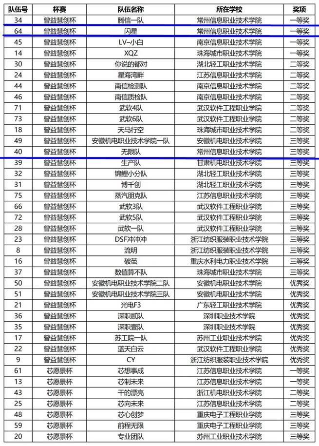 全国大学生集成电路创新创业大赛由工业和信息化部人才交流中心主办。本届大赛分为7个赛道,20个杯赛,吸引来自全国311所高校的4029支本硕博团队报名,参赛选手超万人,指导老师超2000人。学校积极组织师生参加在曾益慧创杯高职赛道比拼。经过初赛突围、决赛角逐,学校电子工程学院电创班徐浩、王慧玲、刘春连同学组成的闪星队获得一等奖;智能装备学院电气自动化专业和工业互联网应用专业的史宇广、渠威、刘才运同学组建的腾信一队获得一等奖,徐轩、李婷和张宣同学组建的无限队获得三等奖。李晴、钱声强、吴以岭、侍孝虎、余文荣、赵建辉获优秀指导教师奖。
