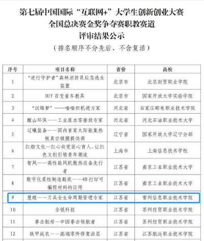 10月13日至10月15日,第七届中国国际“互联网+”大学生创新创业大赛全国总决赛在南昌大学举行。经过激烈角逐,我校《慧眼——刀具全生命周期管理专家》项目以小组第1的优异成绩摘得金奖,这是我校连续三届在该项顶级赛事中夺金,亦成为江苏省唯一“三连金”的双高院校。
