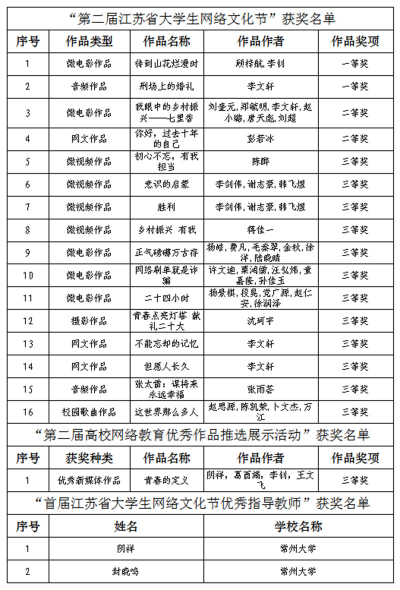 近日,江苏省委教育工委、省教育厅公布第二届江苏省大学生网络文化节和高校网络教育优秀作品推选展示活动遴选结果,常州大学共有17件作品获奖,较去年有大幅度提升。其中,获大学生网络文化节作品一等奖2项,二等奖2项,三等奖12项;高校网络教育优秀作品三等奖1项;我校教师阴祥、封晓鸣获评首届江苏省大学生网络文化节“优秀指导教师”称号。