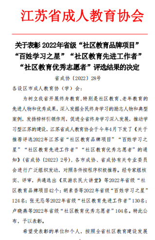 此次表彰是继2018年该项目获省级名师工作室、2019年获省级特色品牌项目、2020年获长三角社区教育特色品牌项目后,再次荣获的殊荣,这也是今年继该项目获评江苏省社会教育(教学)成果后的又一项省级荣誉。