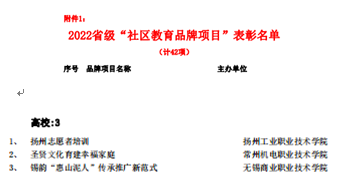 近日,江苏省成人教育协会公布2022年省级“社区教育品牌项目”表彰名单,由常州机电职业技术学院选送的“圣贤文化育建幸福家庭”项目成功入选(高校仅三项)。