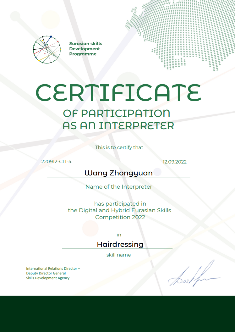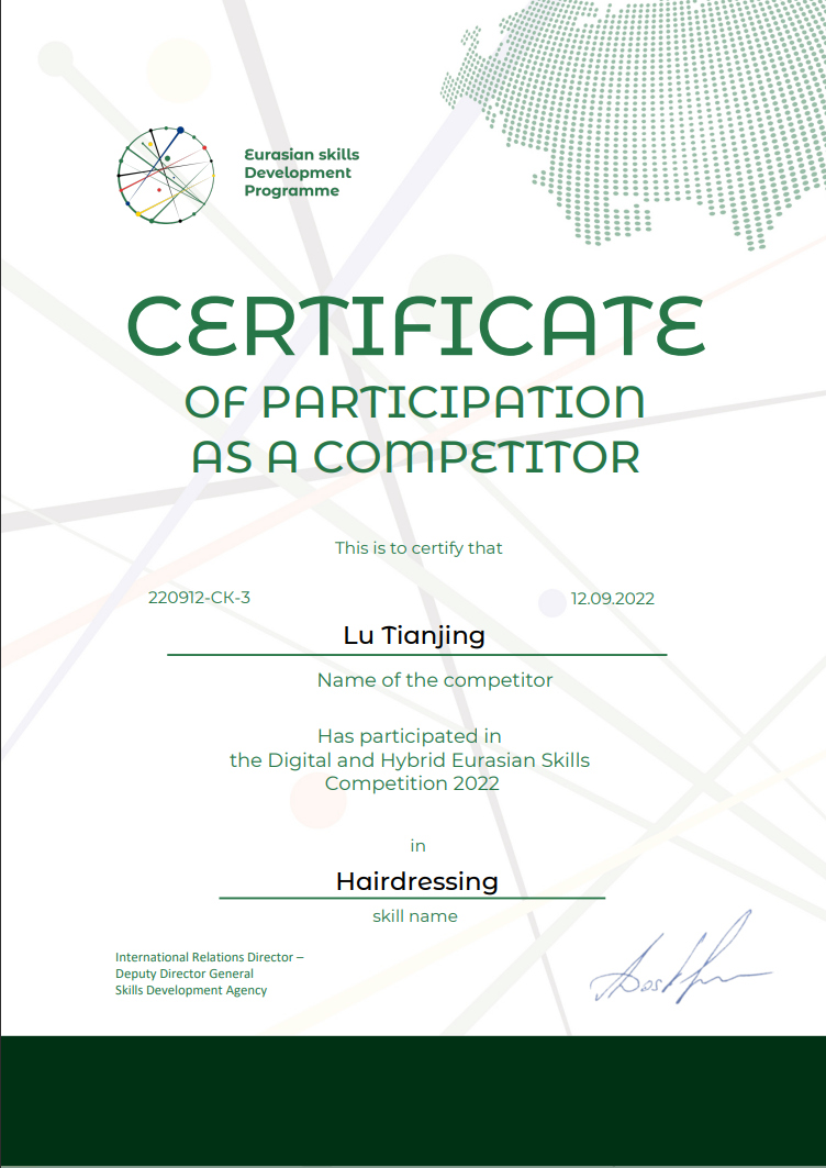 9月8-12日,2022(俄罗斯)金砖+欧亚技能远程国际赛线上赛和线下赛同时举行。常州纺织服装职业技术学院服装学院形象213A鲁天京同学参与该赛事的“美发”赛项,并获得线上赛总分第三名的好成绩。