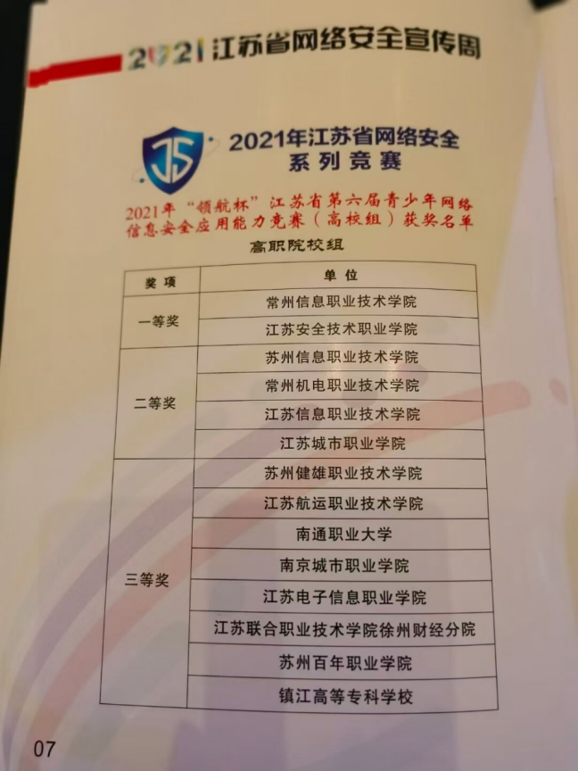 10月9日,由江苏省教育厅和江苏省委网信办共同举办2021年“领航杯”江苏省第六届青少年网络信息安全应用能力竞赛决赛在南京落下帷幕,由我校李建新老师指导,张智源、王睿、汪峰同学组成的参赛队伍获得该赛高职院校组比赛一等奖第一名的优异成绩。