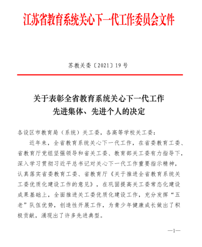 近日,江苏省教育系统关心下一代工作委员会于下发《关于表彰全省教育系统关心下一代工作先进集体、先进个人的决定》(苏教关委〔2021〕19号)文件,我校关工委荣获江苏省教育系统关心下一代工作先进集体荣誉称号。