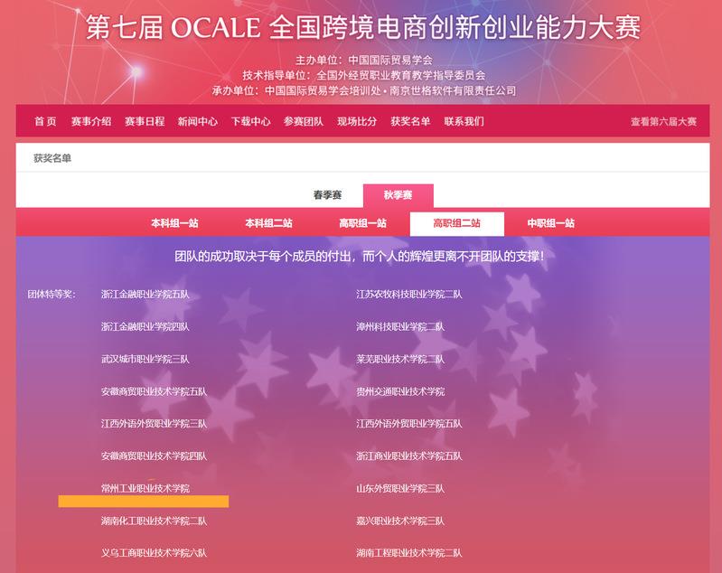 2021年11月15-17日,由中国国际贸易学会主办、全国外经贸职业教育教学指导委员会指导的第七届OCALE全国跨境电商创新创业能力大赛(秋季赛)在线举行,我校经贸管理学院朱传洁和孙斐斐老师指导的19国贸331班学生曾龙祥,20商务331班学生詹章莹、李丽静组成的参赛团队披荆斩棘,历经三天12个回合比赛,勇夺团体特等奖。