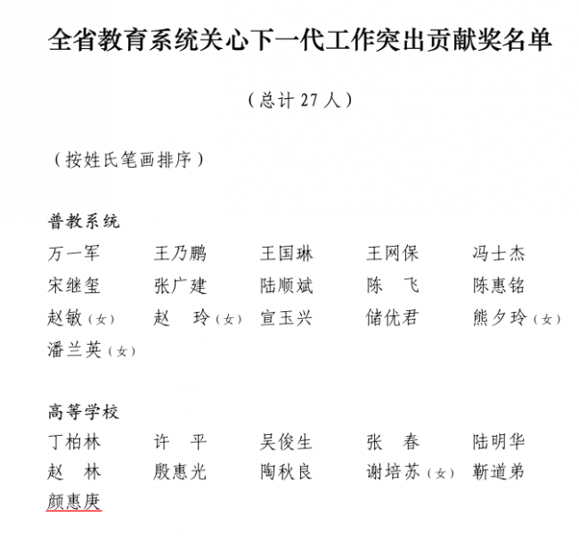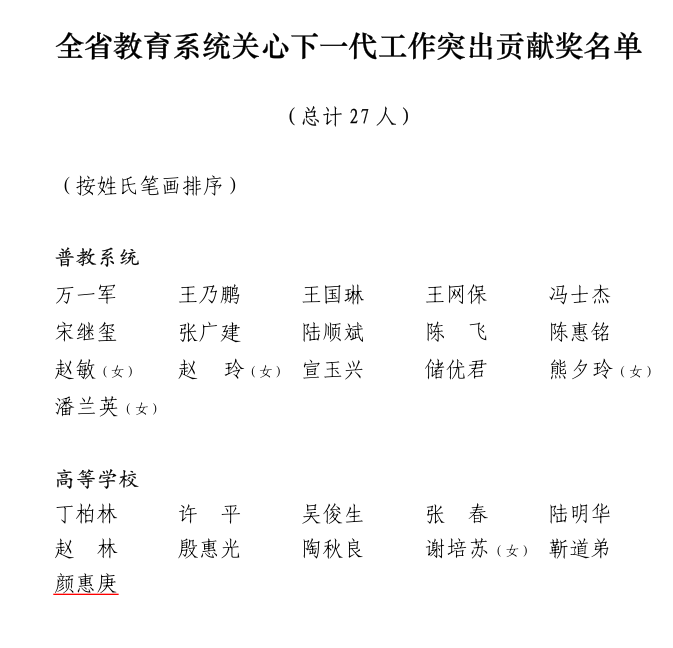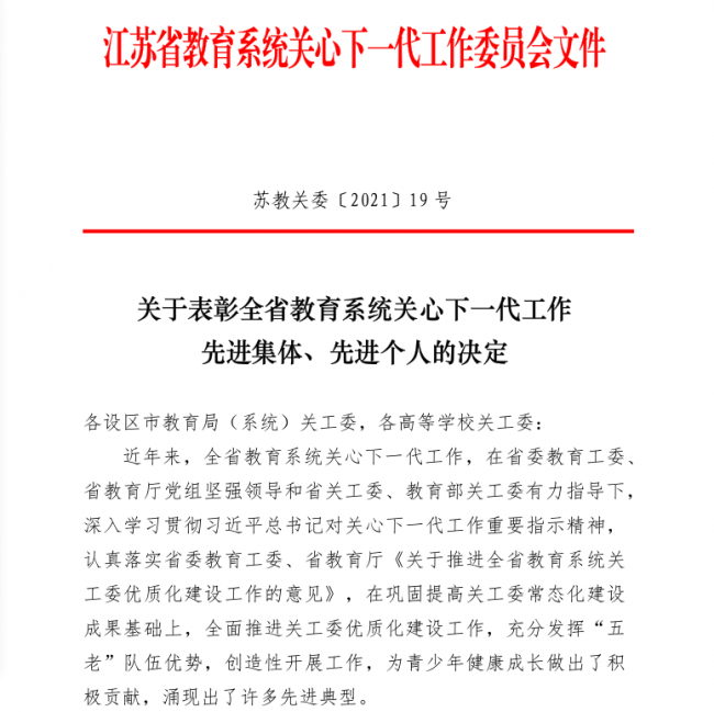 近日,省教育系统关心下一代工作委员会发布《关于表彰全省教育系统关心下一代工作先进集体、先进个人的决定》(苏教关委〔2021〕19 号),我校关工委多项工作受到表彰。学校关工委荣获全省教育系统关心下一代工作先进集体,颜惠庚同志荣获全省教育系统关心下一代工作突出贡献奖,李弘同志荣获全省教育系统关心下一代工作先进个人。