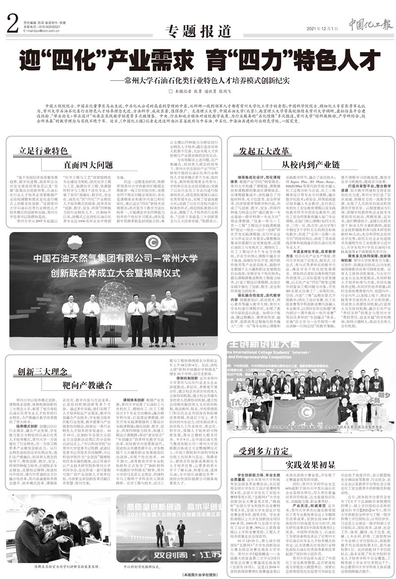 中国工程院院士、中国石化董事长马永生说,中石化从公司的高层到管理的中层,从科研一线到领军人才都有常州大学化工学子的身影;中国科学院院士、精细化工专家彭孝军也认为,常州大学石油石化类行业特色人才培养理念先进、方法科学、成效显著,值得推广。太原理工大学、中国石油大学(北京)、南京理工大学等高校陆续来常州大学调研,虚拟仿真平台建设经验、“毕业论文+毕业设计”双要求实践教学制度等多次被借鉴。中央、行业和地方媒体对该校教学成果、为行业服务的“石化情缘”多次报道,常州大学“经科教联动,产学研结合,校企所共赢”的教学理念与实践不绝于耳。近日,《中国化工报》记者走进这所由江苏省政府与中石油、中石化、中海油共建的行业特色学校,一探究竟。 立足行业特色 直面四大问题 “基于我国经济高质量发展趋势、数字化进程、政府和公众对安全事故的零容忍以及‘双碳’政策出台的新形势,石油石化行业人才培养必须要根据产业结构调整和需求变化进行模式上的根本性创新。”谈到常州大学石油石化类行业特色人才培养模式的创新和实践,常州大学党委书记陈群如是说。 常州大学从2007年起就以“化学工程与工艺”国家级特色专业建设为契机,依托化学工程与工艺、能源化学工程、资源循环科学与工程3个涉化专业,开展了面向“高端化、数字化、安全化、绿色化”的“四化”产业特色人才培养模式的探索,培养具有“创新、数字、安全、环保”四种能力的行业特色人才。自2016年以来,该模式已在该校石油石化类专业近1000名毕业生中得到实施。 但这一过程是曲折的,陈群带领常州大学的教师们根据长期教育一线工作经验分析,发现有四个现实问题必须面对:首先是课程体系和教学内容已相对固化,难以适应“四化”新技术发展要求;其次是当下教学方法比较单一,不能满足学生四种能力培养的个性化学习需求;再次是教学资源多数是封闭独立的,难以支撑以四种能力为特征的行业特色人才培养;最后是协同育人机制不完善,无法实现人才供给侧与产业需求侧的良性互动。 为有效解决上述问题,在产教融合、协同育人理念的指导下,常州大学在面向产业“四化”转型升级的石油石化类行业特色人才培养模式多个方面,组织学生、教师和管理者全员参与,学校和石化企业协同联动;突破了以往只在化工专业内进行探索的形式,将范围拓展到石油石化类其他专业,实现了受益面最大化;突破了以往只在校内进行探索的形式,将范围拓展到石化企业,增强了人才培养的行业特色。“总结下来就是三大创新理念与五大改革举措。”陈群表示。 创新三大理念 靶向产教融合 常州大学以培养模式创新、课程体系创新、体制机制创新的三大理念入手,彰显了地方高校石油石化类专业人才培养的行业特色,为产教融合教学改革提供了常大样本。 培养模式创新 创建以回应行业需求、融合产业发展、学生能力复合为特征的石油石化类人才培养模式,常州大学一方面强化了行业特色,另一方面又跨界多产业激发创新活力。从行业特色高校的办学优势出发,他们在产教融合、协同育人理念的指导下,聚焦创新、数字、安全、环保四种能力培养,打破院系专业壁垒,克服校企障碍,推进校内外协同、课内外贯通的全方位融合性改革,其内容涵盖培养理念提升、培养模式改革、课程体系优化、教学内容与方法变革,以及协同机制创新等多个方面。通过多年实践,他们实现了人才培养贴近产业需求,教学内容融合产业技术,学生能力培养匹配行业发展,教学要素与产业链条协同联动,探索出一条行业特色人才培养的有效途径。10月19日,在2021年全国大众创业万众创新活动周江苏分会场启动仪式上,“中以科创学院”由常州大学党委书记陈群、武进区党委书记乔俊杰共同揭牌,中以科创学院作为“全创改”揭榜挂帅任务实施的载体,由江苏省中以产业技术研究院和常州大学共同举办,旨在形成一套可复制可推广的产业创新人才培养经验,为国家全面创新改革贡献江苏智慧、常州方案。 课程体系创新 根据产业发展,常州大学设置了石油加工与有机化工、精细化工、化工工程设计3个专业方向模块;融合跨学科内容,打造理论课程链、研究开发实践课程链和工程设计实践课程链;强化创新、数字、安全、环保四种能力培养,构建工程设计课程群;带动“虚实结合”“专创融合”的多样化教学方法改革,加快教学内容更新迭代,促进校企共建资源平台,学生根据个人兴趣和职业发展规划自由选择,实现个性化培养。10月25日,高等教育评价专业机构软科正式发布了“2021软科中国最好学科排名”榜单,常州大学的马克思主义理论、环境科学与工程两个学科首次入围该榜单。化学工程与技术、动力工程与工程热物理排名分别较去年上升18位和4位。至此,该校入围“软科中国最好学科排名”增至10个学科,创历史新高。 体制机制创新 近年来常州大学多次与石化行业龙头企业深度联动,多层次、多维度开展合作,建立校企共同合作的育人主体协同机制,建立校企共建共享的育人资源协同机制,建立校企同频共振的育人文化协同机制,推动教师、院系、学校管理部门和石化企业共同深化和拓展改革领域,形成自下而上、多方协同的内生动力,切实推动多元协同育人工作系统化