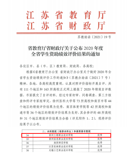 近日,江苏省教育厅、江苏省财政厅联合发文公布2020年度全省学生资助绩效评价结果,我校再传捷报,位列本科院校(培养本科生)和高职高专院校组别第一名,连续十年获得“优秀”等级。