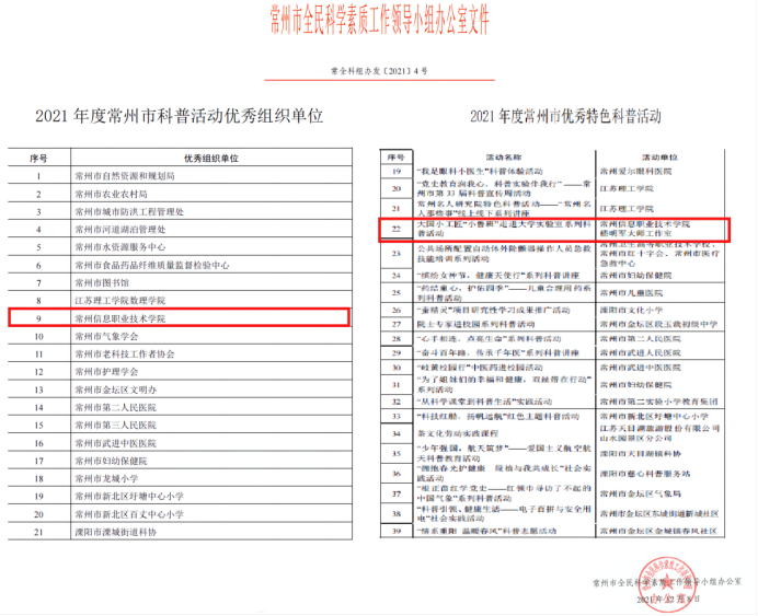 近日,我校被常州市全民科学素质工作领导小组办公室评为2021年度常州市科普活动优秀组织单位,我校智能装备学院嵇明军大师工作室承办的“大国小工匠——‘小鲁班’走进大学实验室”系列公益科普活动被评为2021年度常州市优秀特色科普活动。