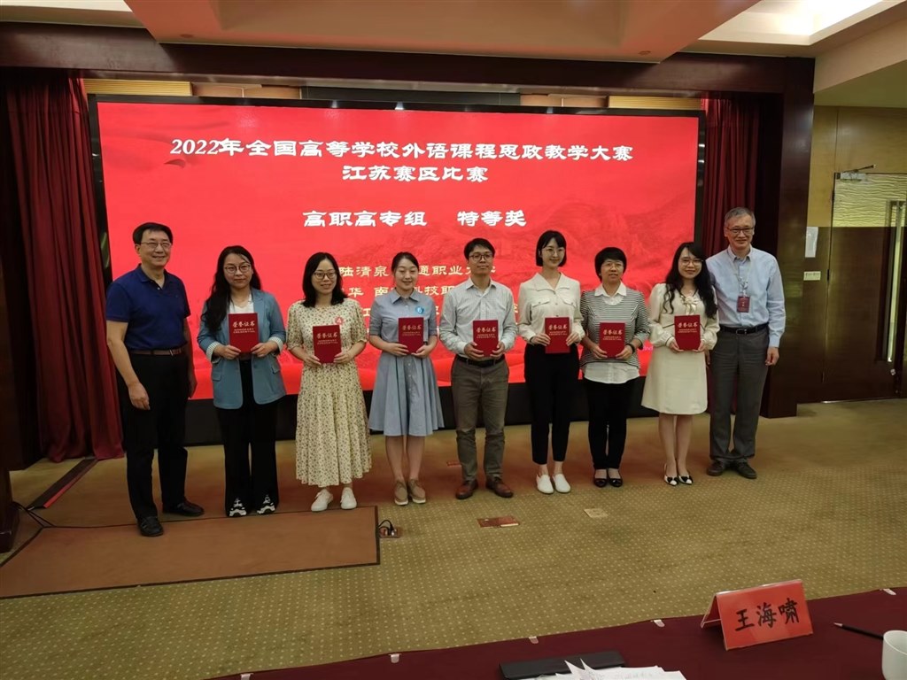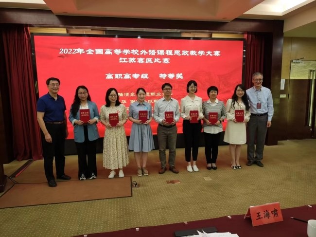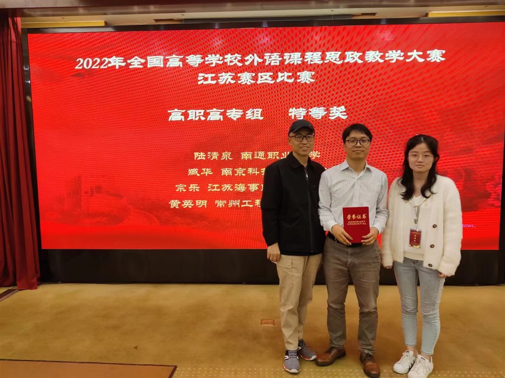 9月29日下午,全国高等学校外语课程思政教学大赛江苏赛区决赛(线下比赛)在南京钟山宾馆举行。经初赛、复赛两次选拔后,共有18支代表队进入决赛。常州工程职业技术学院通识部教师黄英明、娄立国、吴玥宁三人所组成的代表队喜获高职高专组特等奖。