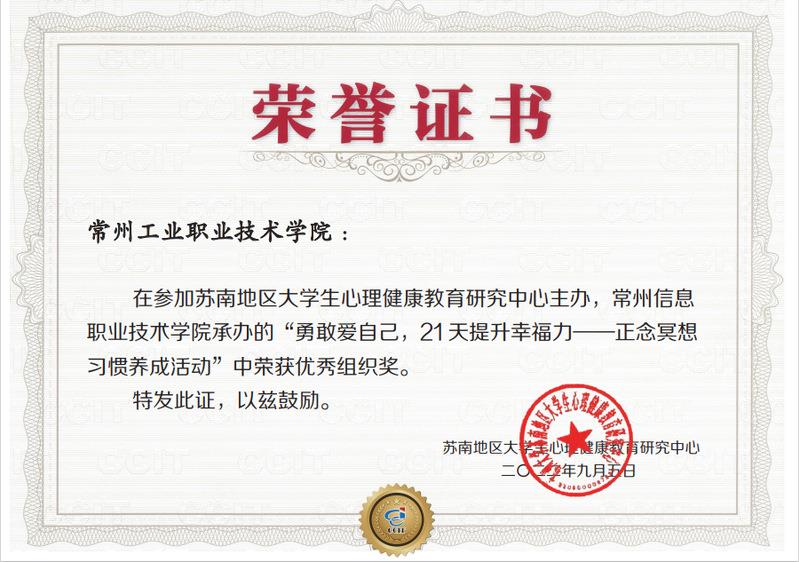 近日,在苏南地区大学生心理健康教育研究中心开展的“勇敢爱自己,21天提升幸福力——正念冥想习惯养成活动”中,常州工业职业技术学院荣获优秀组织奖。