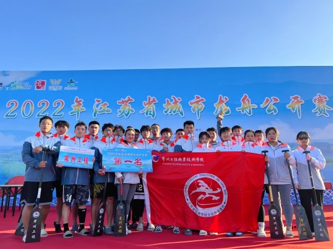 10月22日至23日,2022江苏省城市龙舟公开赛于常熟沙家浜举行。本次赛事由江苏省体育局、江苏省体育总会、常熟市人民政府主办。竞赛项目分为公开组22人龙舟200米、500米直道赛,共有来自苏州、南通、扬州、常州等地的12支代表队参与此次赛事。在其他11支队伍全为男运动员的竞赛背景下,常州工程职业技术学院由16名男生和6名女生组成的励志龙舟队,秉持坚持不懈、勇往直前的体育精神,在激昂有力的鼓点鼓舞下,劈波斩浪,勇往直前,夺得200米、500米、总成绩全部赛项冠军,完美诠释了“同舟共济、奋勇争先”的龙舟精神。