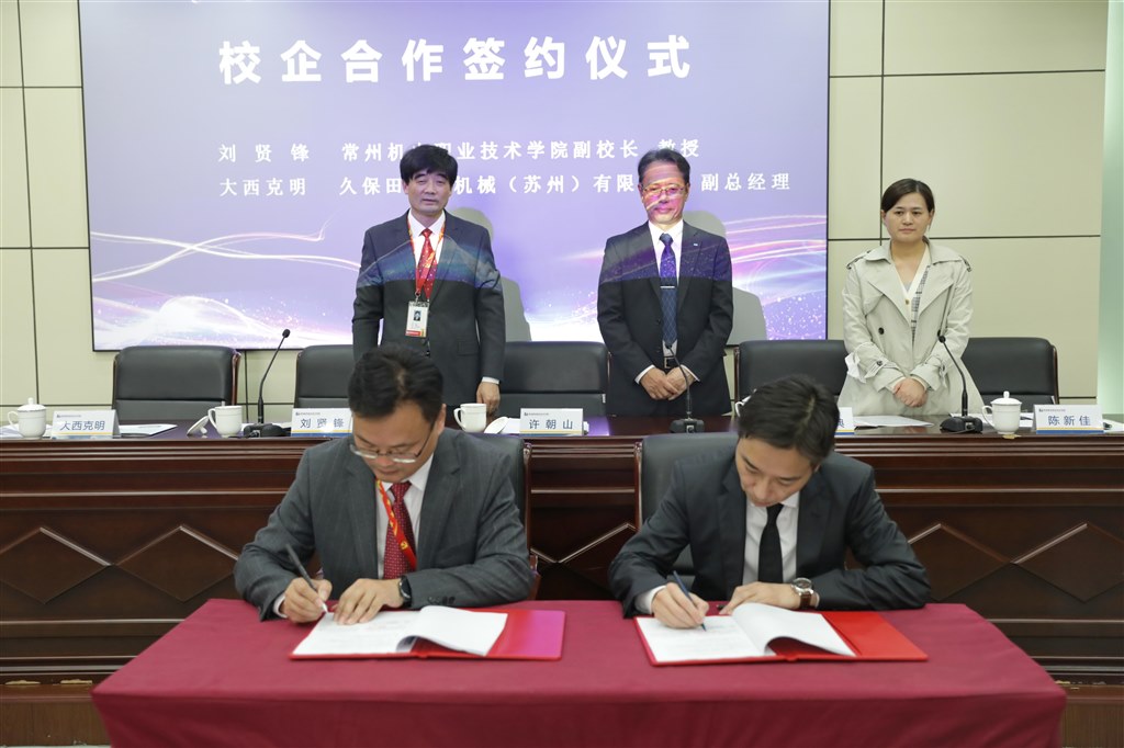 10月12日,常州机电职业技术学院与久保田农业机械(苏州)有限公司共建产业学院、现代学徒制订单人才培养合作签约仪式在图书馆紫厅举行。学校校长许朝山、副校长刘贤锋,久保田农业机械(苏州)有限公司总经理谷和典、副总经理大西克明出席,车辆工程学院副院长吴海东、王峰等领导和久保田订单班全体师生共同参加了签约仪式。