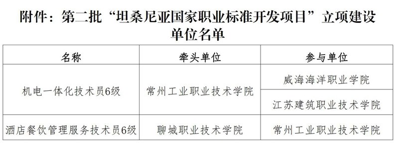 近日,中非职业教育联盟公布“坦桑尼亚国家职业标准开发项目”第二批立项建设单位名单,常州工业职业技术学院机电一体化技术员6级、酒店餐饮管理服务技术员6级两项专业标准入选。