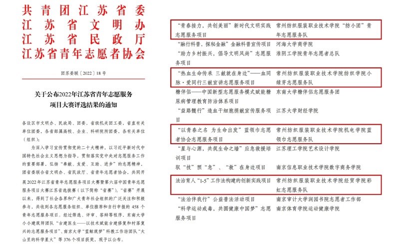 近期,由团省委、省文明办、省民政厅、省青年志愿者协会共同举办的2022年江苏省青年志愿服务项目大赛暨第六届中国青年志愿服务项目大赛江苏省选拔赛落下帷幕。本次大赛采用线上线下相结合的形式,即项目线上参与路演答辩,线下集中评审。常州纺织服装职业技术学院的“纺小团”青年志愿服务队“青春接力,共创美丽”新时代文明实践志愿服务项目、机电学院蓝领巾志愿服务队“以青春之名 为生命出发”志愿服务项目、经贸学院彩虹志愿服务队法治育人“1-5”工作法构建的创新实践项目、纺织学院小绿芽志愿服务队“热血生命传承 三献就在身边”——血同脉·爱同行三献宣讲志愿服务项目分获省赛三等奖。